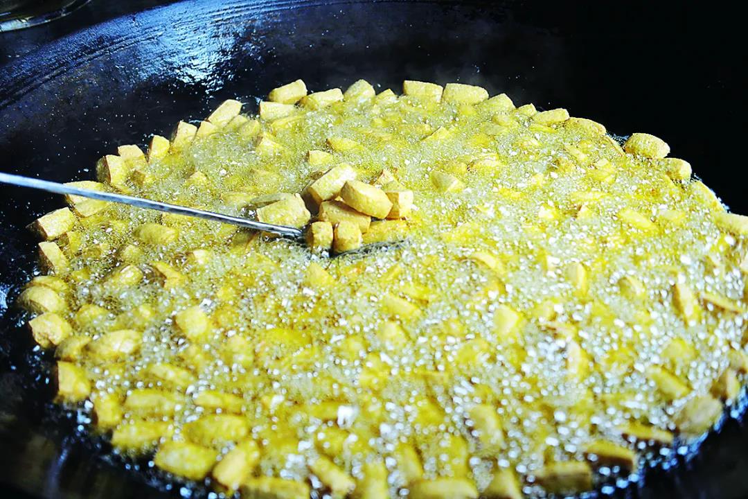 口袋豆腐的制作時,先把做好的豆腐壓緊發(fā)酵, 然后切成小方塊放入油鍋,炸到皮呈金黃脆殼,用漏勺撈出放入土堿水中浸泡,而土堿水中浸泡環(huán)節(jié)則最為關(guān)鍵。
