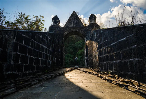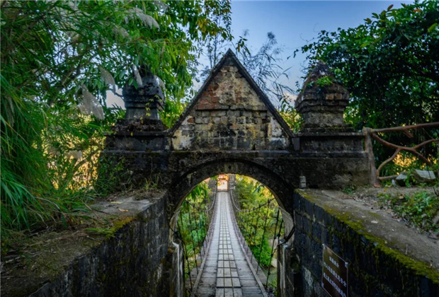 景在龍川江鐵索橋,此橋?yàn)楣糯z綢之路“赴府正道”的必經(jīng)之地,因地勢險要、景色壯觀而被古人列入“騰沖十二景”之一,名曰“萬里虹山”。