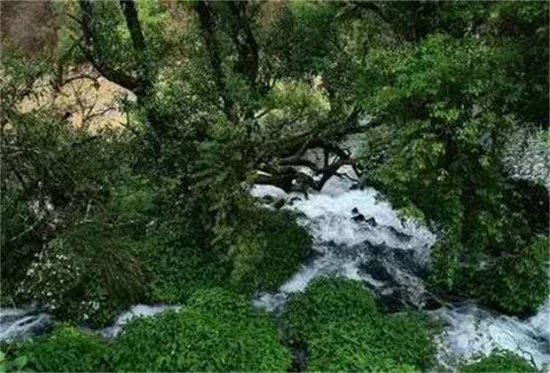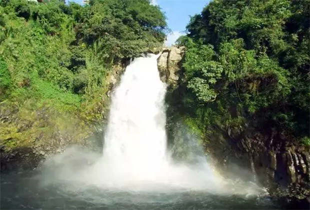 疊水河瀑布高46米,瀑布兩邊崖壁上排列著奇妙的柱狀節(jié)理群,大盈江水流經(jīng)此處,從30多米的高巖上跌落,響聲雷動(dòng),水花四濺,形成了“不用弓彈花自散”的壯麗景觀。