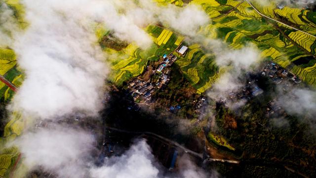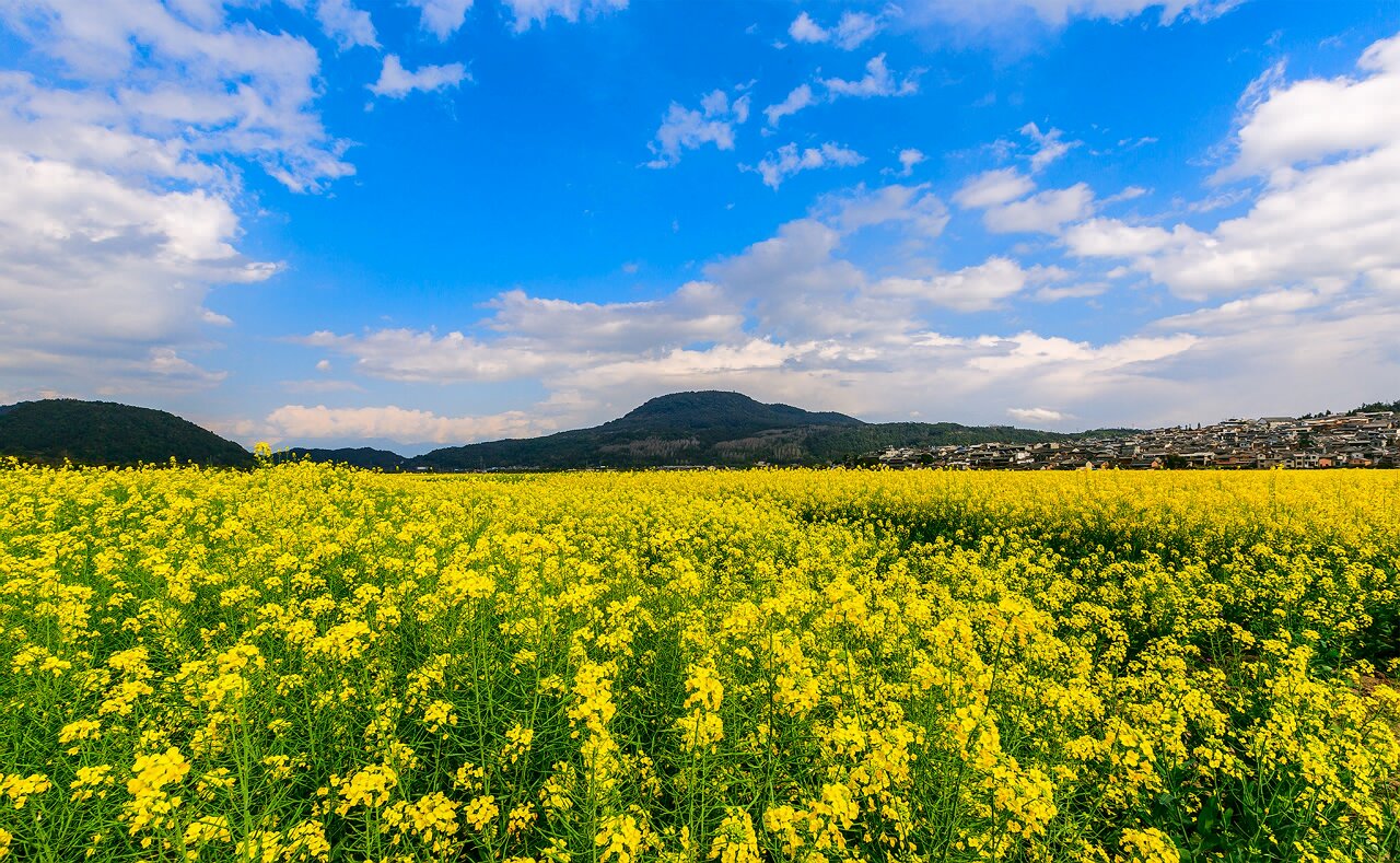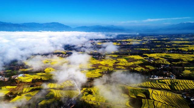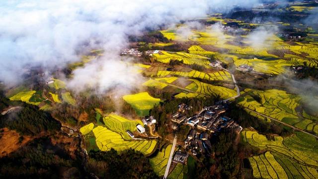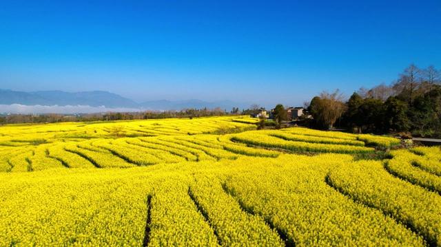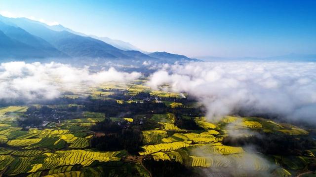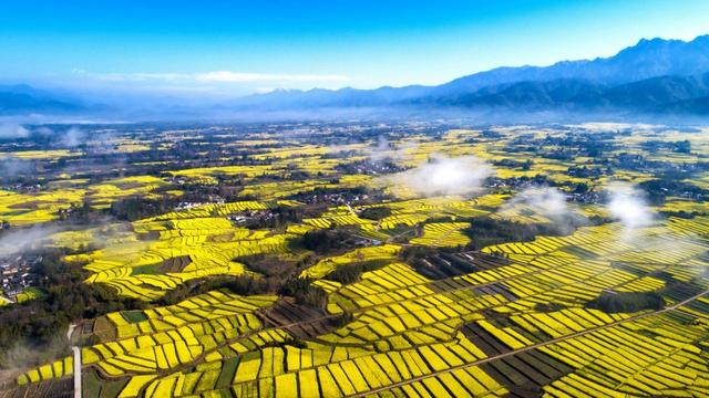 二月末,寒氣逐漸消退,春風(fēng)伴著細(xì)雨把色彩鋪灑在大地上??矗且荒鼽S在迅速蔓延著,是的,田疇之間的油菜花開了,無邊無際,就像鋪在大地上的絨毯,在群山之間,藍(lán)天白云下,描繪出一幅幅最美的阡陌畫卷。