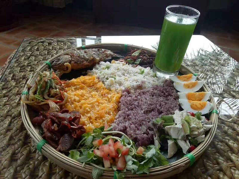 手抓飯是云南傣族特色美食,沒有固定的形態(tài),一般是在簸箕上鋪上洗凈的芭蕉葉,然后在中間均勻鋪上各色米飯,米飯有白米飯、紫米飯和黃色米飯(由染飯花煮制或加入南瓜制作而成)。周圍放上配菜有干巴、烤魚、雞蛋、炸蝦、時蔬、涼拌菜,炸排骨、花生米,烤豬皮、炸五花肉等等,再配上色彩艷麗的水果點綴其中,一份手抓飯就做好了。