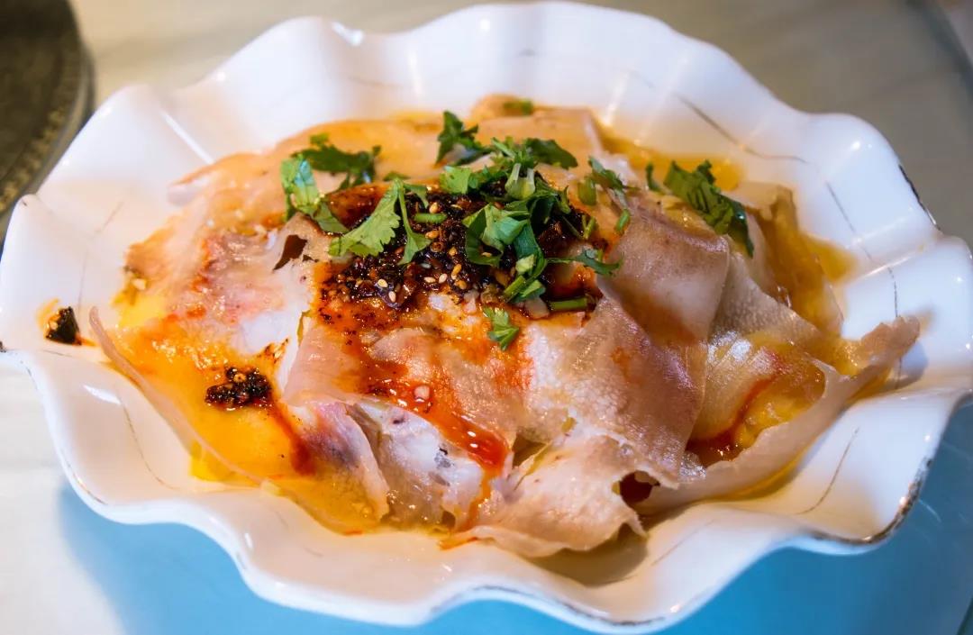 大薄片為滇西名菜,工于火候,長于刀法,用特制的豬頭肉,片的大薄片大如手掌,薄如蟬翼,放入特制蘸水中一涮,不油不膩,脆嫩鮮爽,回味無窮。