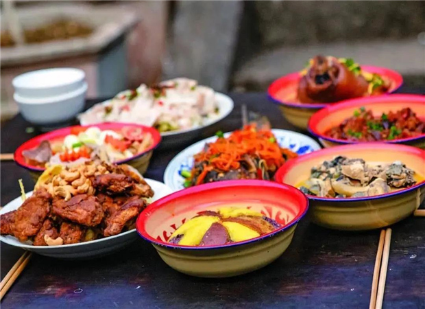 在騰沖宴席中,影響大者,首推“八大碗”。“八大碗”在騰沖地方史志資料中稱為“八簋”?!绑睘楣糯尘撸w圓形,肚大,口底略收。由此可知“八大碗”歷史久遠,聲名赫赫。騰沖“八大碗”食材多樣,內(nèi)容豐富。有葷有素,有甜有咸,有熱有冷,有香有脆,有湯有羹。做工精細,搭配講究,可調(diào)眾口,可飽眾腹,實為騰沖飲食的代表作。
