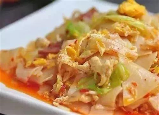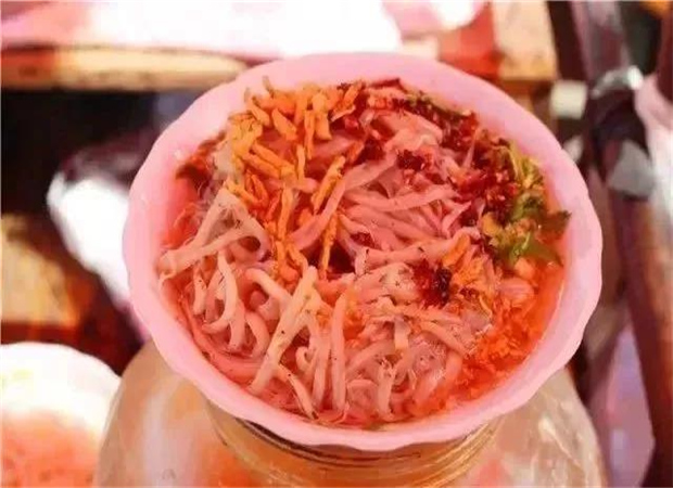 擦粉是用甜蕎面制成的涼粉,吃法多,調(diào)料也多,但必須用當(dāng)?shù)氐拿纷哟?。騰沖擦粉雖好吃,但卻不開店專營,都是挑著小擔(dān)子沿街銷售。